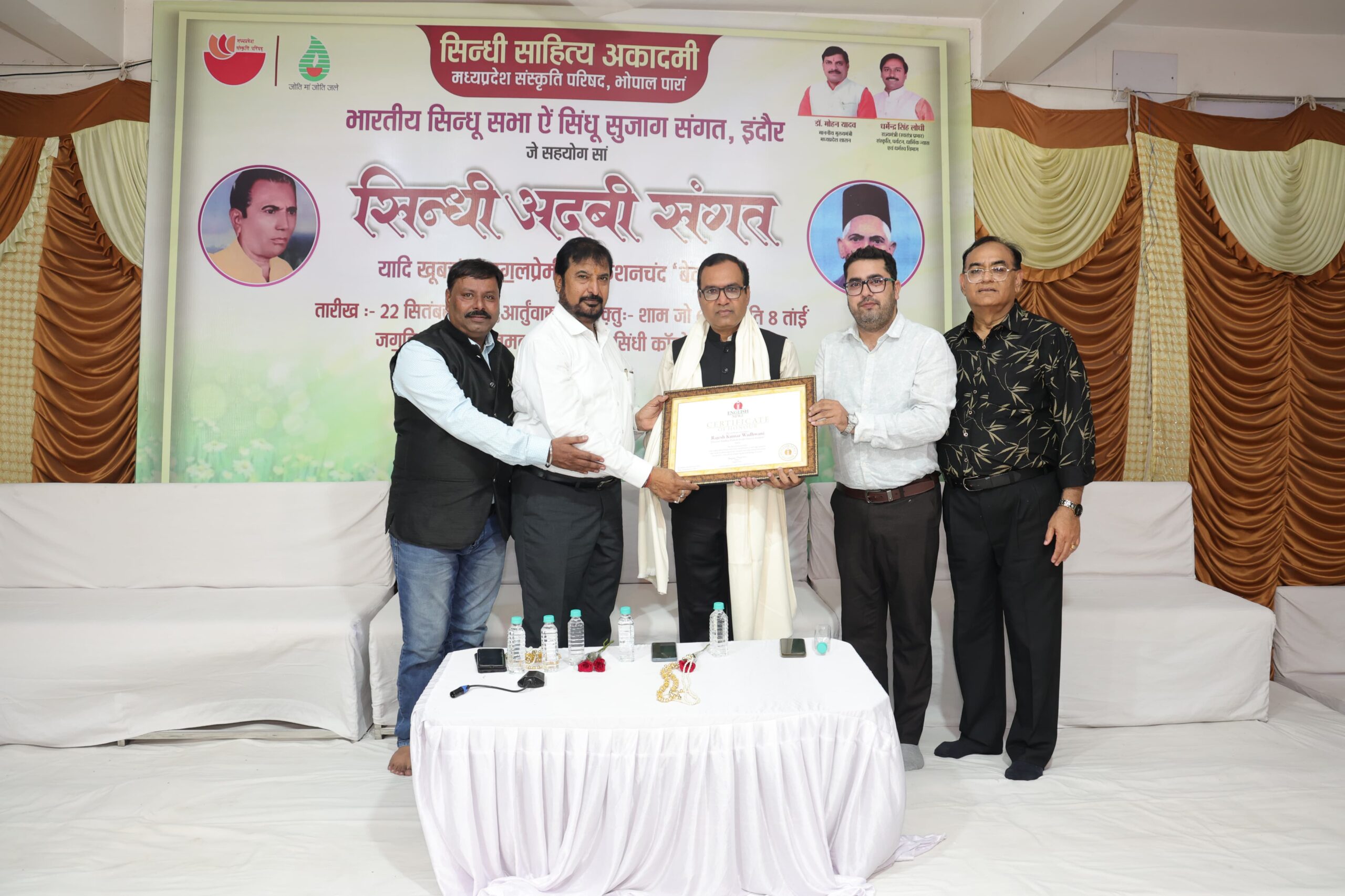 इंदौर. निरंतर साहित्यिक आयोजनों के माध्यम से सिन्धी साहित्य के संरक्षण व संवर्धन हेतु अकादमी द्वारा किये जा रहे प्रयास अत्यंत सराहनीय हैं। उक्त विचार भारतीय सिन्धू सभा म.प्र. के प्रांतीय अध्यक्ष गुलाब ठाकुर ने प्रीतमदास सभागृह में व्यक्त किए। भारतीय सिन्धू सभा, इंदौर व सिंधु सुजाग संगत-इंदौर के सहयोग से ’अदबी संगत’ का आयोजन किया गया था। नरेश फुँदवानी ने बताया कि साहित्यकार नमोश तलरेजा ने खूबचंद ‘पागलप्रेमी’ के व्यक्तित्व एवं कृतित्व पर प्रकाश डाला। हरेश सेव्हानी ने किशनचंद ‘बेवस’ की साहित्यिक जीवन यात्रा का उल्लेख किया। इस मौके पर सुजाग संगत के कलाकारों ने विनीता मोटलानी द्वारा लिखित और नमोश तलरेजा द्वारा निर्देशित एक लघु सिन्धी नाटक प्रस्तुत किया गया।