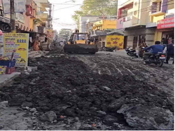 भागीरथपुरा के भीतरी इलाकों में भी ड्रेनेज और नर्मदा पाइपलाइन का काम चल रहा है। एक चाय की दुकान के सामने से गुजरने वाली सड़क पर जेसीबी से खुदाई कर पाइपलाइन बिछाई गई है और अब उसे भरने का काम प्रगति पर है। इस कारण यहां आवागमन लगभग ठप हो गया है और स्थानीय लोग गलियों के रास्ते आना-जाना कर रहे हैं।