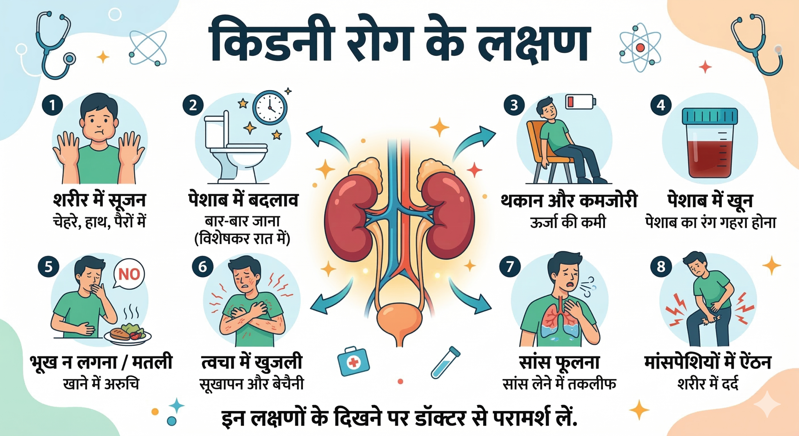 किडनी रोग के शुरुआती संकेतों में थकान, पैर-हाथ में सूजन, भूख न लगना, पेशाब में बदलाव या खून आना, त्वचा में खुजली, सिरदर्द, रात में बार-बार पेशाब आना और मांसपेशियों में ऐंठन शामिल हैं। इन्हें नजरअंदाज करना भारी पड़ सकता है।