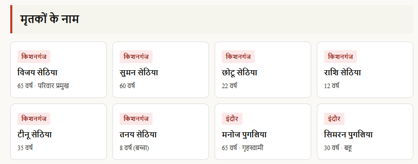 मृतक विजय सेठिया (65 वर्ष) गंभीर रूप से अस्वस्थ थे और परिवार के साथ इंदौर स्थित अपने रिश्तेदार पुगलिया परिवार के घर में ठहरे हुए थे। एक रात यह परिवार मेहमान बना और दूसरी रात तक इस भयावह हादसे ने उन्हें हमेशा के लिए छीन लिया।