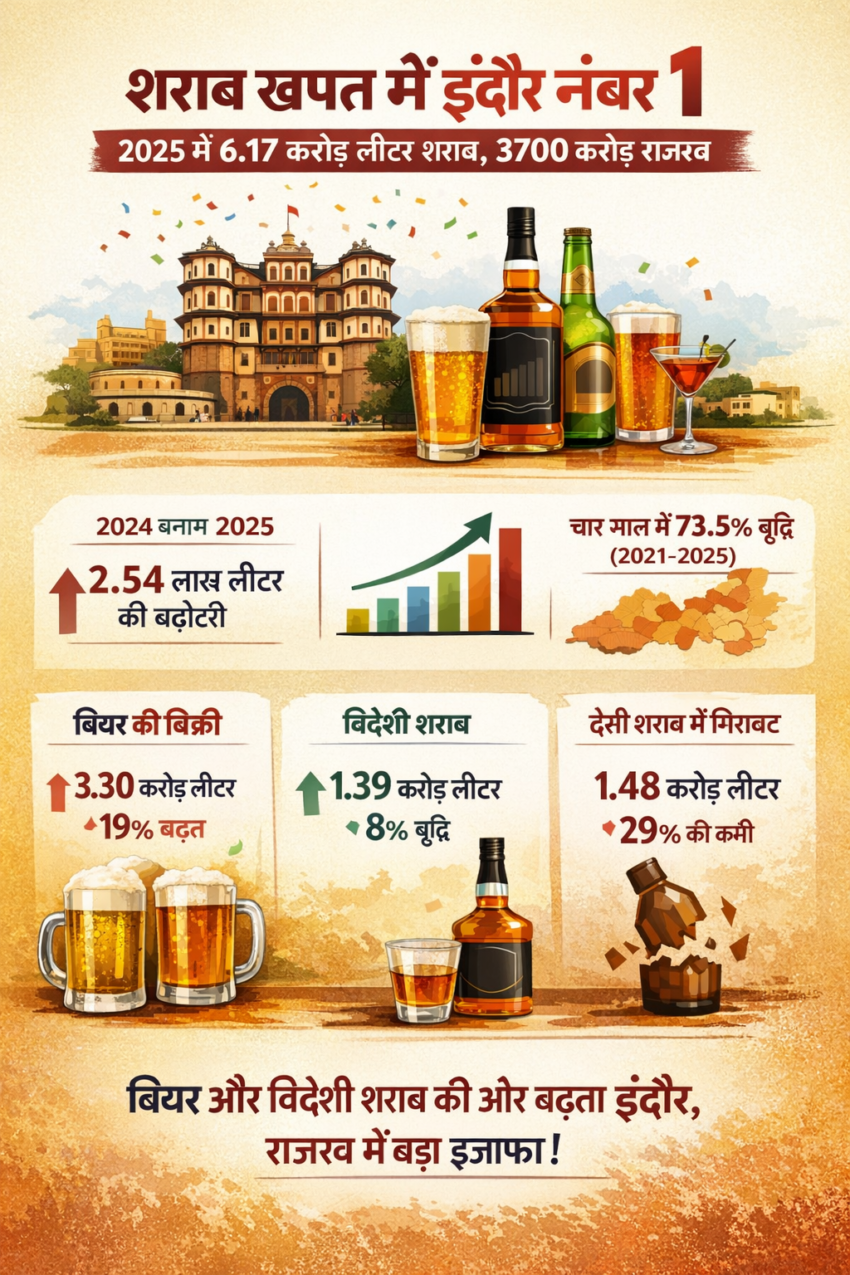 देशभर में स्वच्छता और नागरिक सुविधाओं के लिए पहचान बना चुका इंदौर अब शराब की खपत के मामले में भी मध्य प्रदेश में शीर्ष पर पहुंच गया है। वर्ष 2025 की वार्षिक रिपोर्ट के मुताबिक इंदौरवासियों ने शराब खरीद के सभी पुराने रिकॉर्ड तोड़ दिए। इस दौरान शहर में कुल 6.17 करोड़ लीटर शराब की बिक्री हुई, जिसकी बाजार कीमत 3731 करोड़ रुपये से अधिक आंकी गई है। इस भारी-भरकम बिक्री से जहां मदिरा उपभोक्ताओं ने नया कीर्तिमान बनाया, वहीं राज्य सरकार के राजस्व में भी बड़ा इजाफा हुआ है।