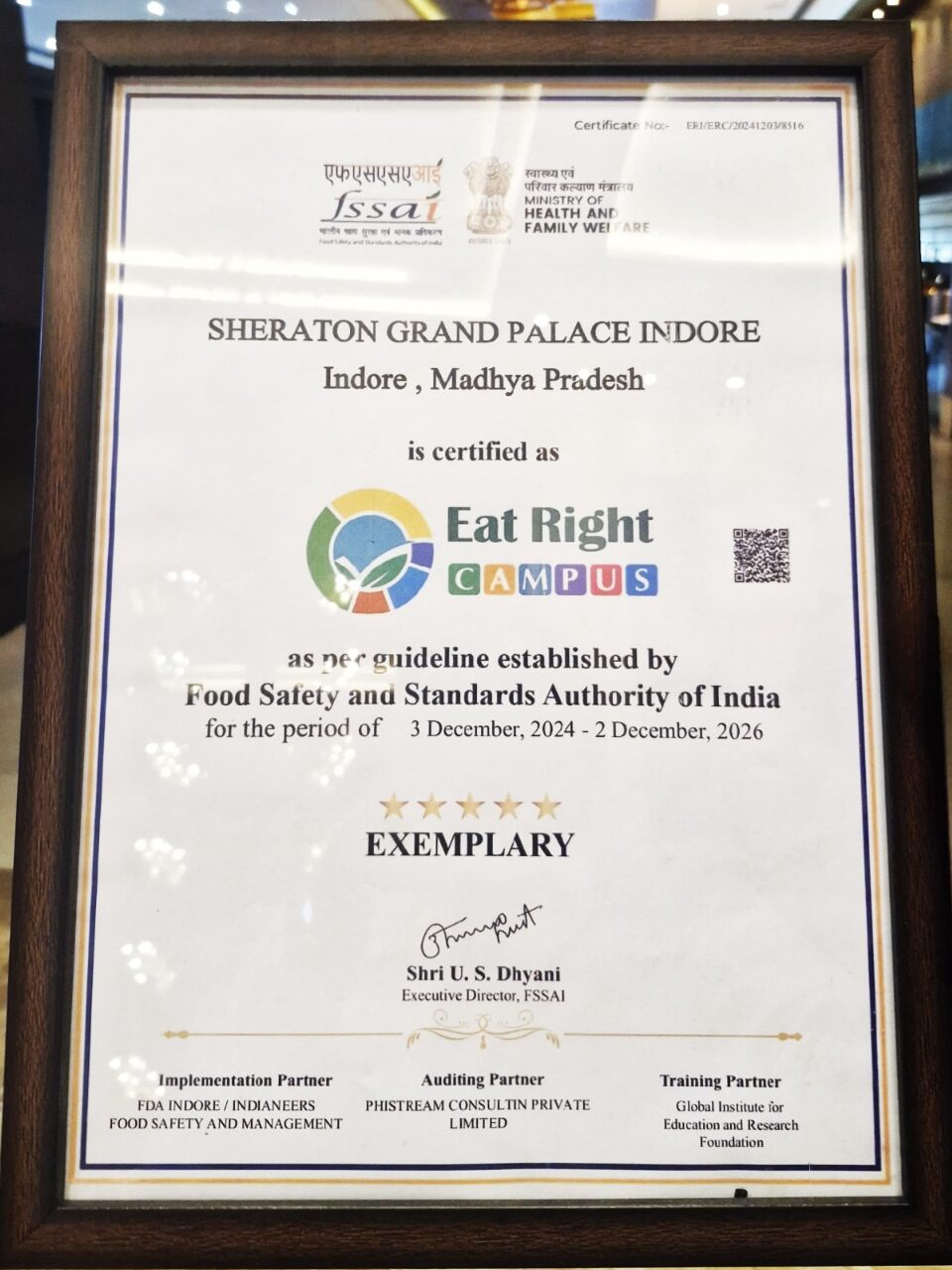 इंदौर के जिला कलेक्टर ने एक विशेष समारोह में यह प्रतिष्ठित सर्टिफिकेट प्रदान किया। शेरेटन ग्रैंड पैलेस ने FSSAI द्वारा निर्धारित सभी कड़े मानदंडों को सफलतापूर्वक पूरा किया है।
