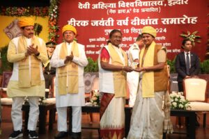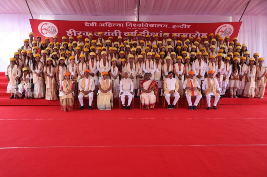 राज्यपाल मंगूभाई पटेल ने अपने संबोधन में कहा ‘दीक्षांत समारोह माता-पिता के त्याग और विद्यार्थियों की कड़ी मेहनत का प्रतीक है। मुख्यमंत्री डॉ. मोहन यादव ने देवी अहिल्या बाई के जीवन को प्रेरणास्रोत बताते हुए कहा मध्य प्रदेश नई शिक्षा नीति लागू करने वाला पहला राज्य है। राष्ट्रपति मुर्मू ने स्वच्छता में असाधारण उपलब्धियों के लिए इंदौर के नागरिकों को बधाई दी व शहर की पहचान देवी अहिल्या बाई की विरासत को बताया। इस मौके पर केंद्रीय महिला एवं बाल विकास मंत्री सावित्री ठाकुर सहित कई अन्य अधिकारी व जनप्रतिनिधि उपस्थित थे। इंजीनियरिंग स्नातक शुभ लाड ने चार पदकों के प्रभावशाली स्कोर के साथ समारोह का नेतृत्व किया, जबकि तीन अन्य छात्रों ने तीन-तीन पदक हासिल किए और 13 छात्रों को दो पदकों से सम्मानित किया गया।