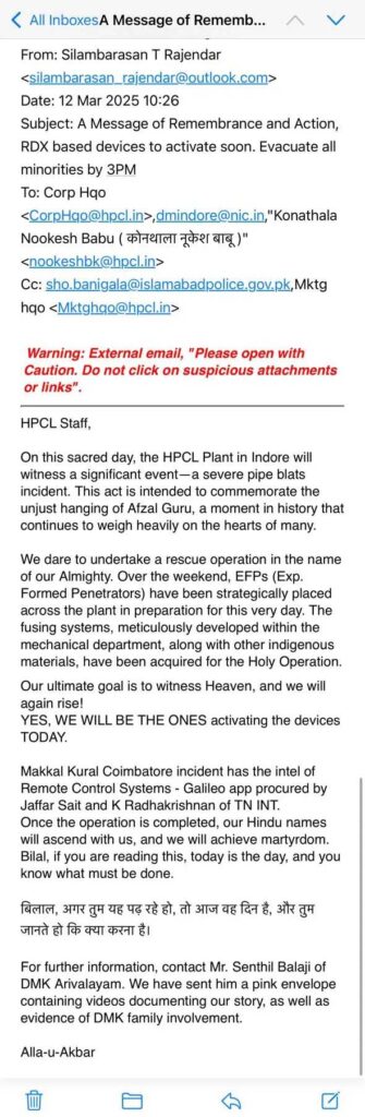 धमकी भरा यह ई-मेल बुधवार सुबह 10:26 बजे एचपीसीएल प्लांट को प्राप्त हुआ, जिसे silambarasan_rajendra@outlook.com से भेजा गया था। मेल की कॉपी एचपीसीएल के आधिकारिक ई-मेल CorpHqo@hpcl.in, इंदौर कलेक्टर, और अन्य अधिकारियों को भी भेजी गई। चौंकाने वाली बात यह है कि मेल की सीसी पाकिस्तान स्थित इस्लामाबाद पुलिस के आधिकारिक ई-मेल sho.banigala@islamabadpolice.gov.pk को भी भेजी गई है।